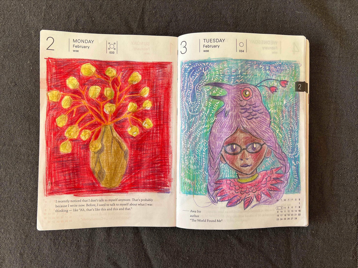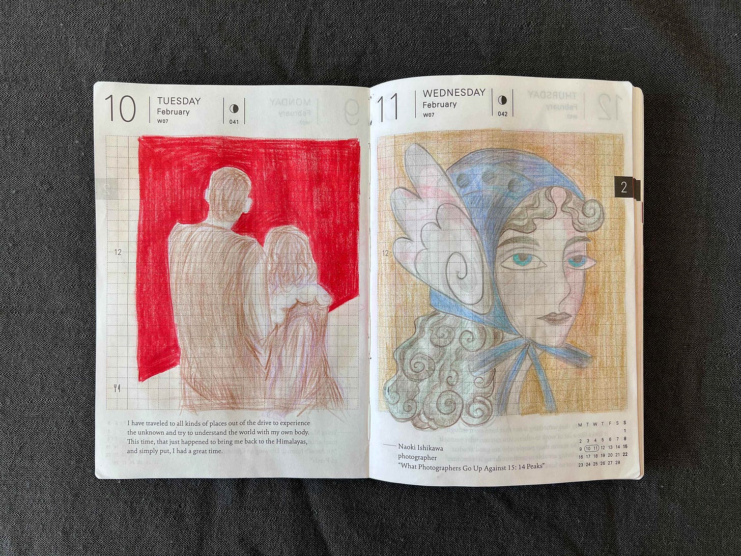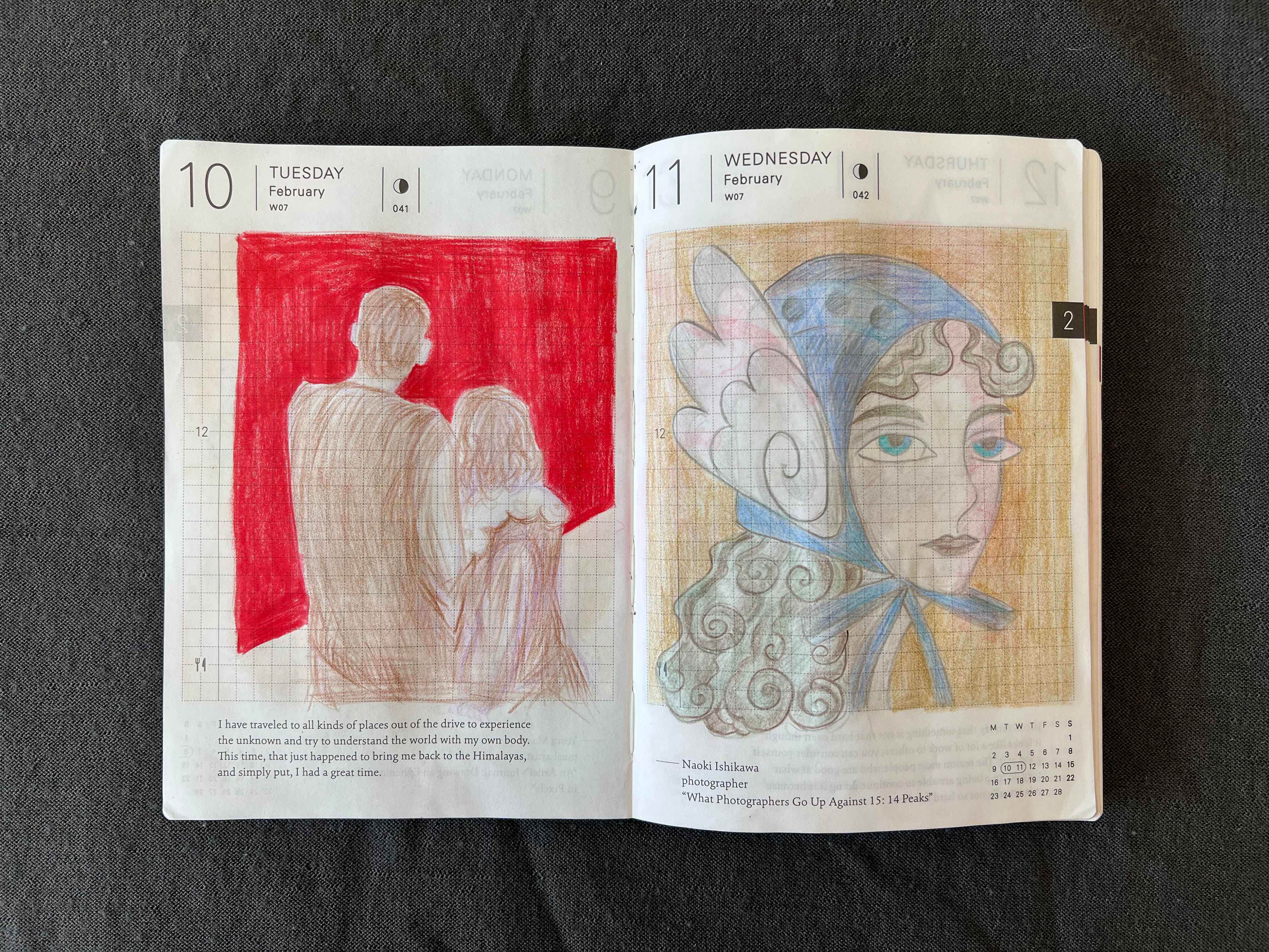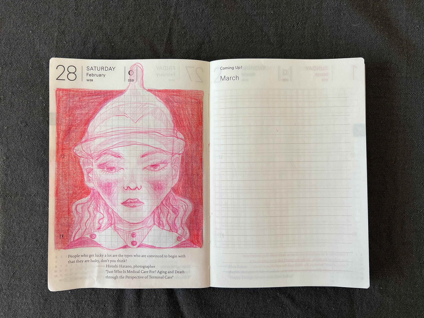 Here I drew my small Japanese vase with a tree branches that I foraged from a mysterious tree in front of Foundation Juan March in Madrid but still can’t identify. I’m not a fan of this red background but for some reason I decided to use a lot of red this February. On the next day I drew a crow girl and tested how white ball pen will work together with colored pencils.