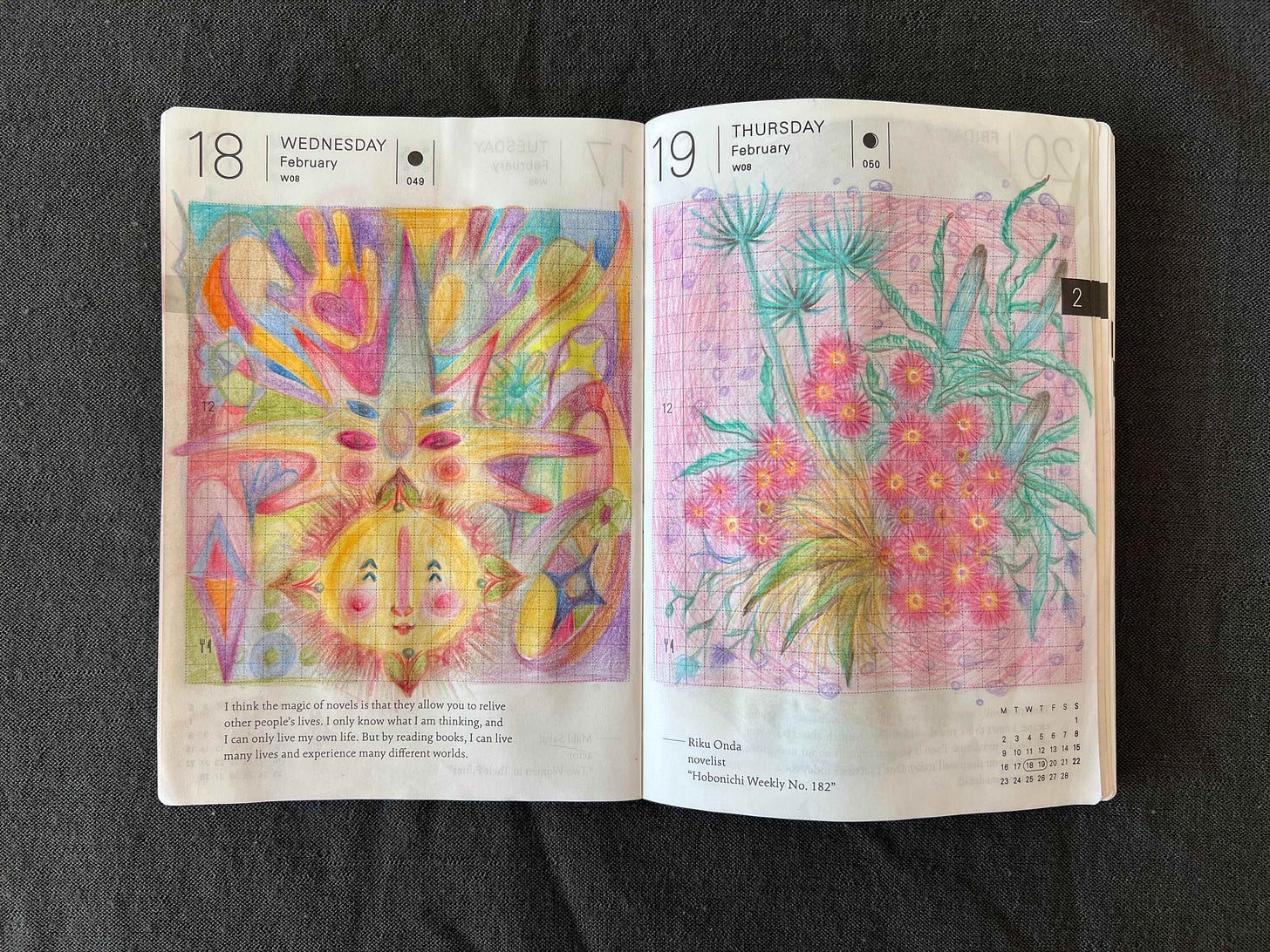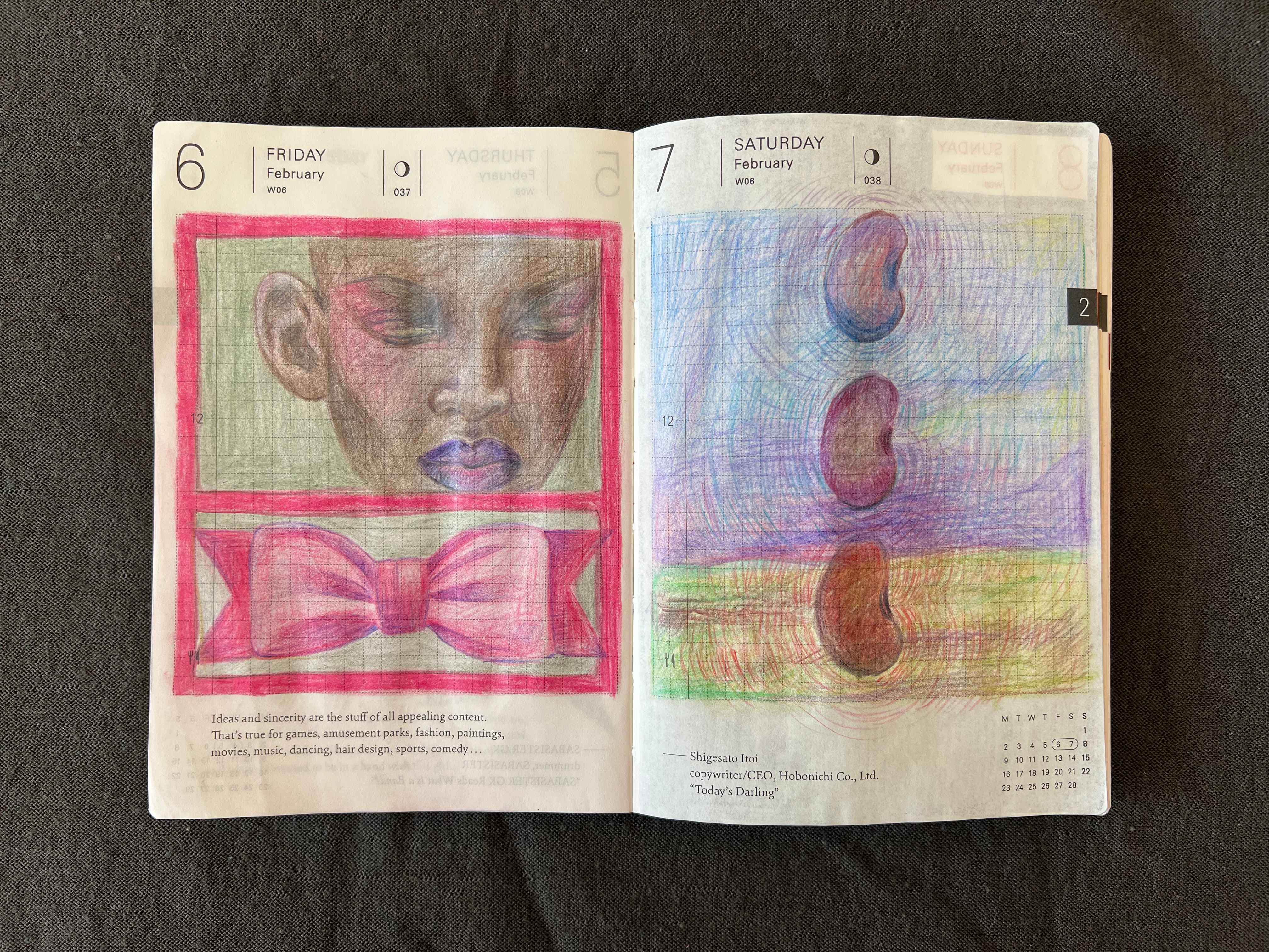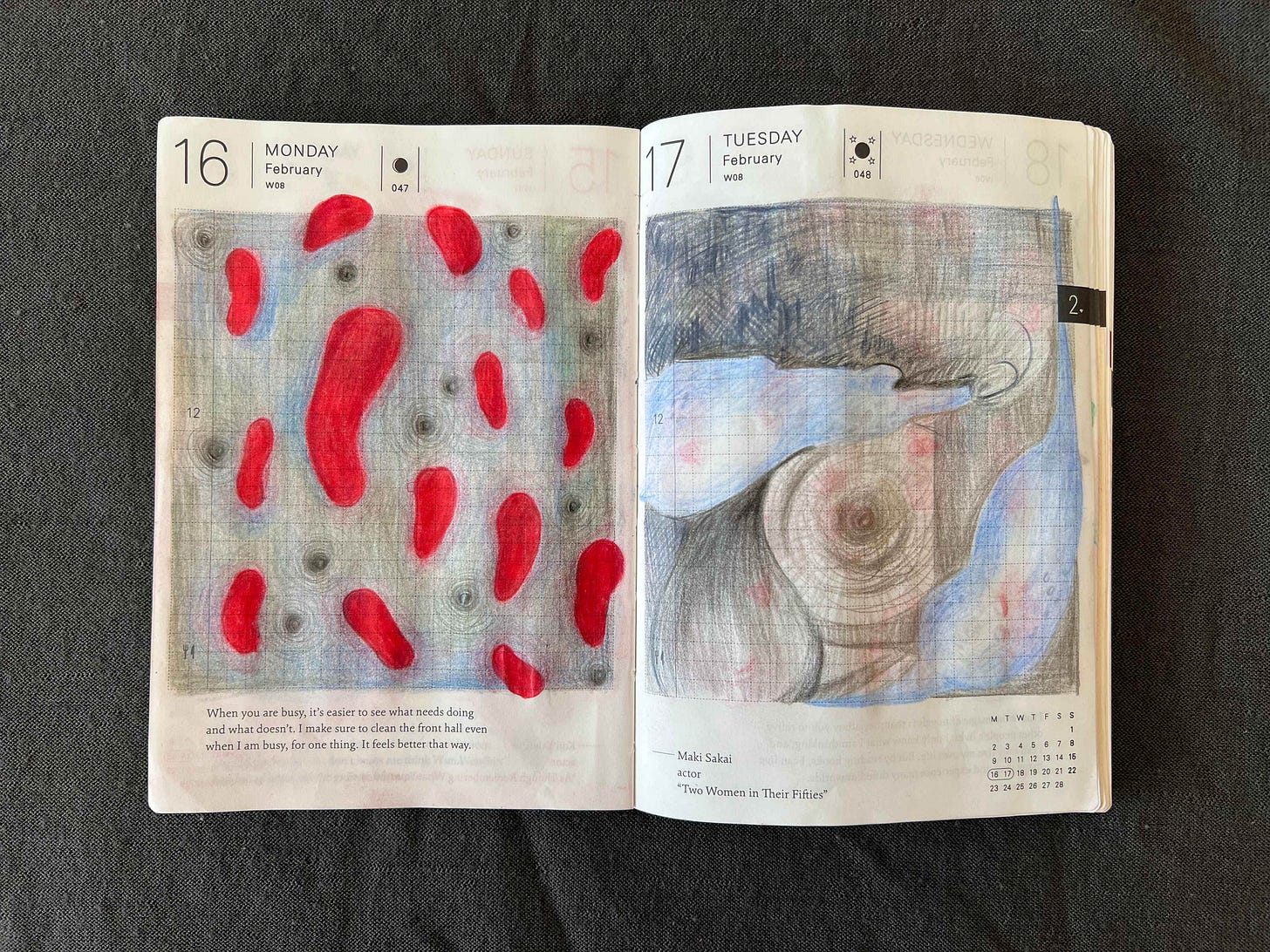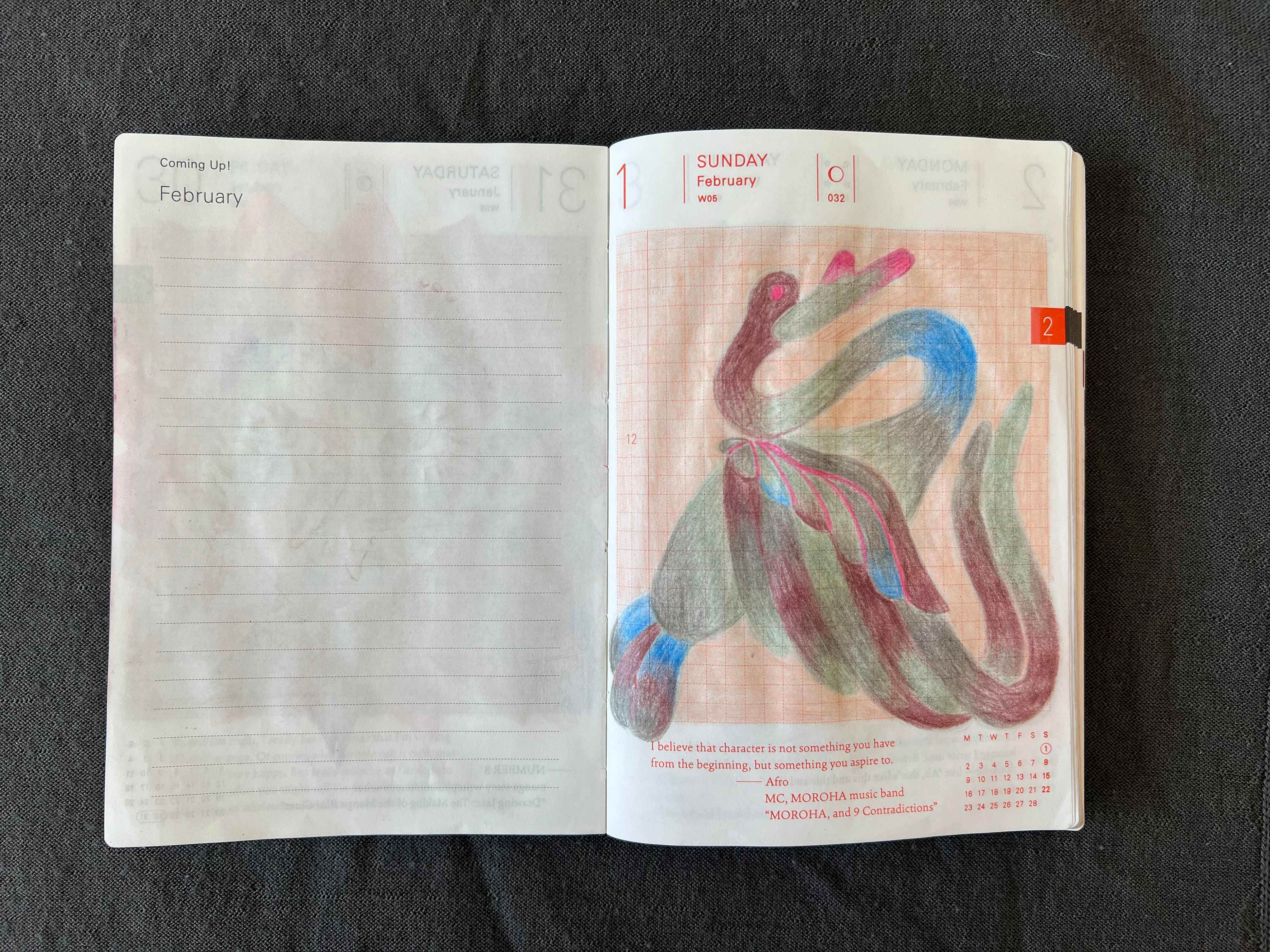 Here I drew my small Japanese vase with a tree branches that I foraged from a mysterious tree in front of Foundation Juan March in Madrid but still can’t identify. I’m not a fan of this red background but for some reason I decided to use a lot of red this February. On the next day I drew a crow girl and tested how white ball pen will work together with colored pencils.