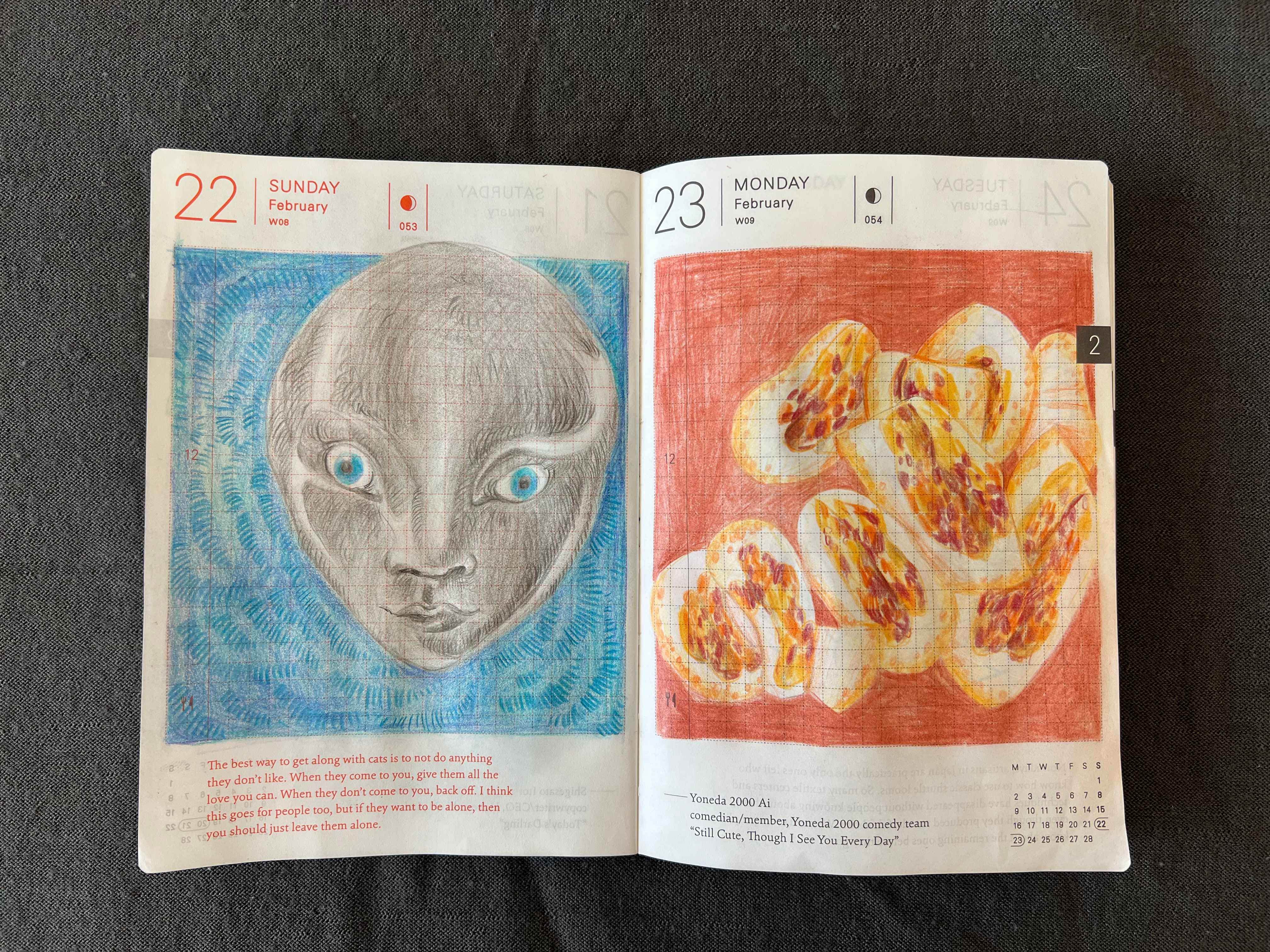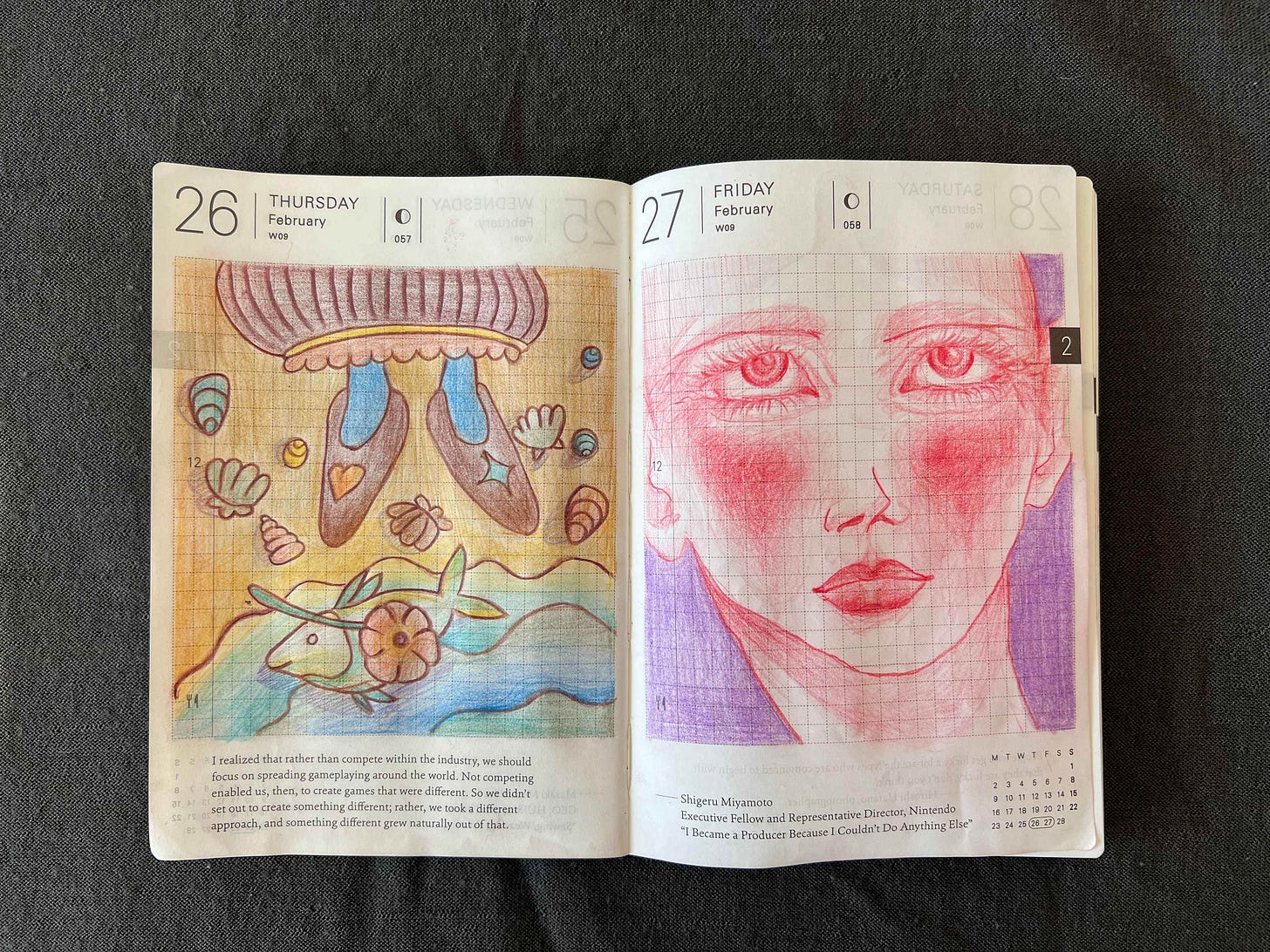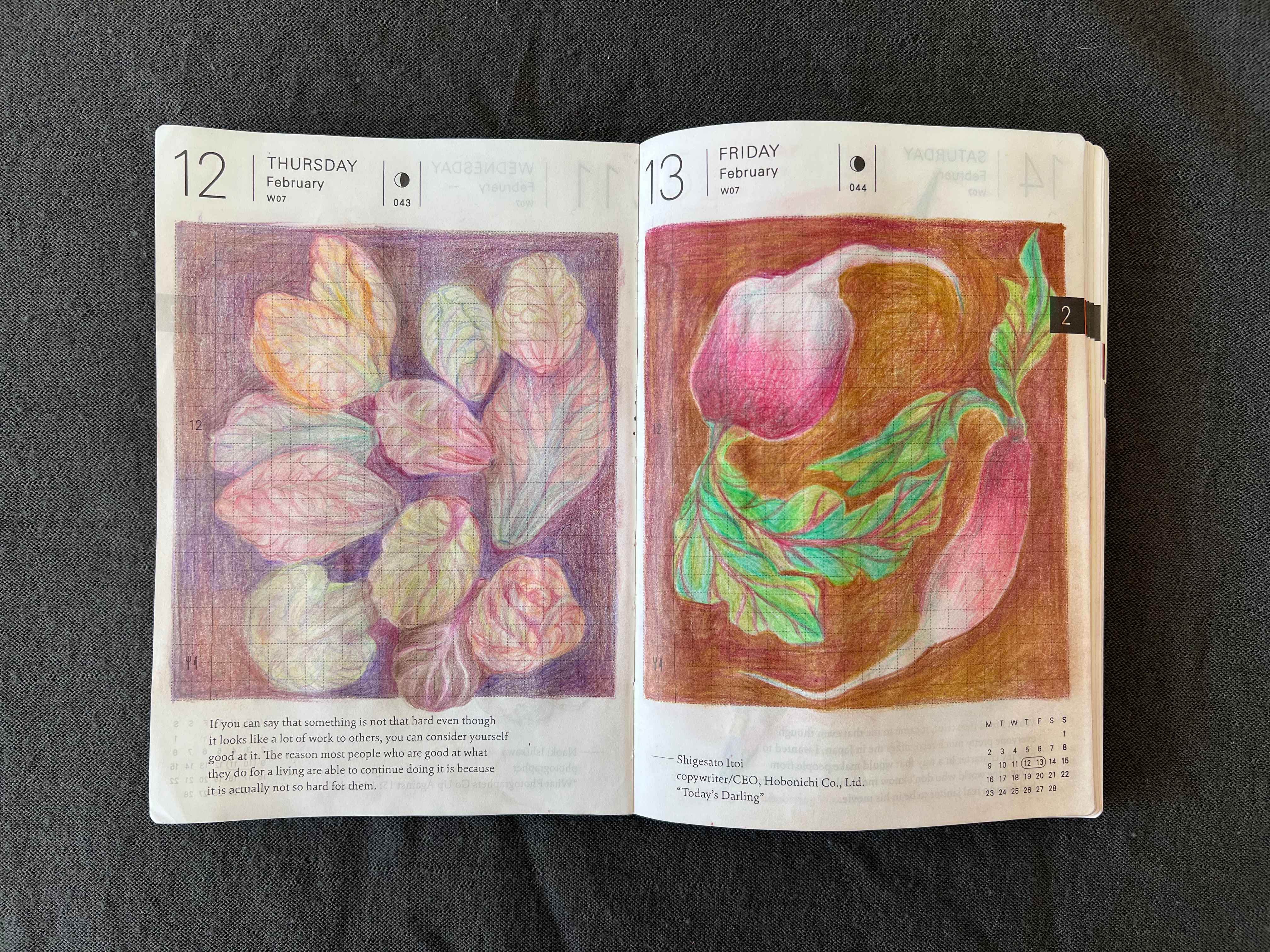 Next is my farming spread. I’ve been playing a lot of Stardew Valley this month (can’t recommend it enough for decompressing) and decided to just draw vegetables that I love: cabbages and radishes. Radishes are my favorite breakfast add-on, I have a bath of them in the fridge most of the time (so they stay crisp) and they are just so fun to draw with their natural pink gradient flush and curly tails.