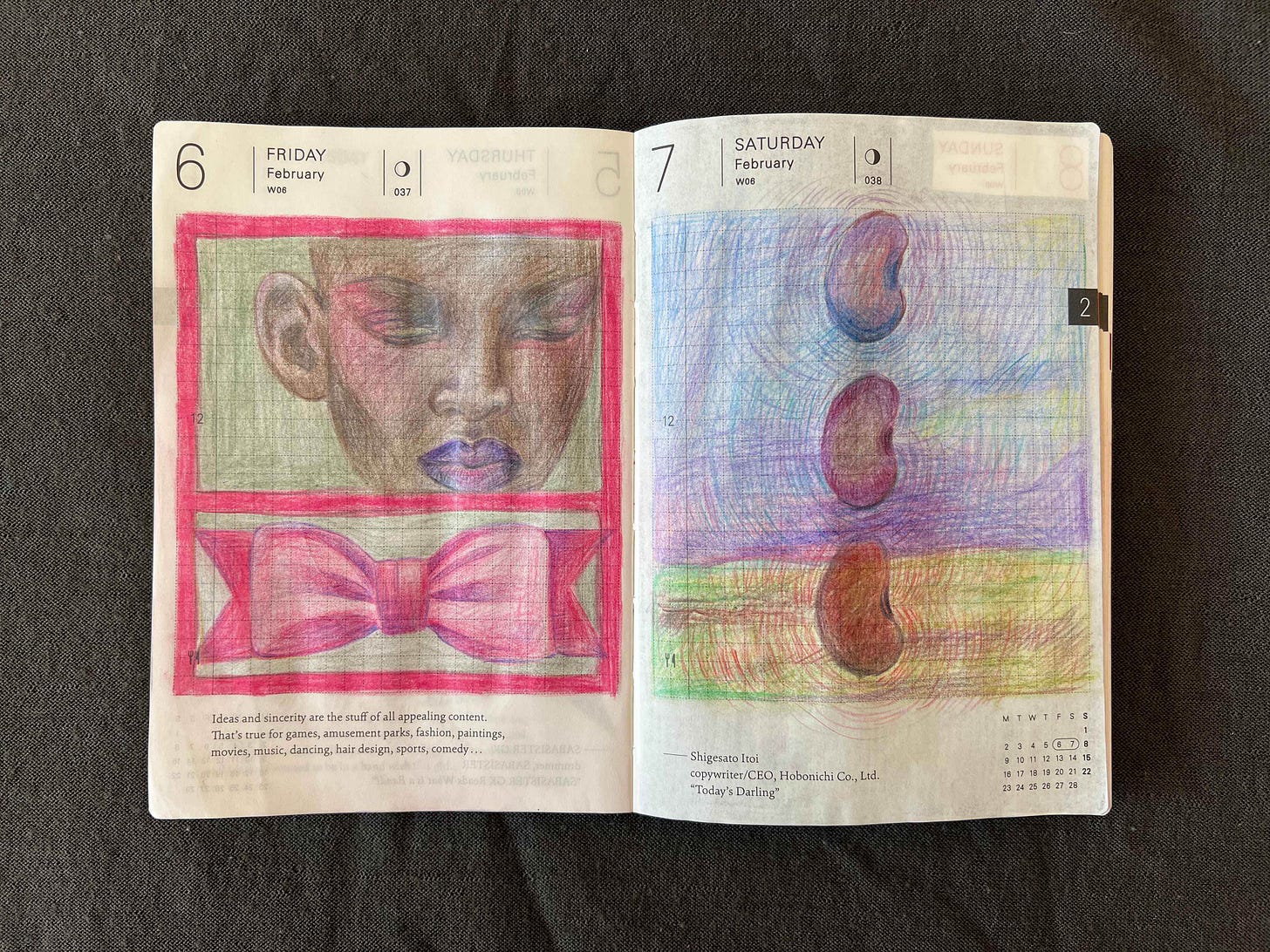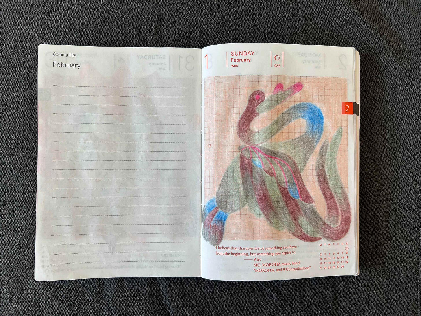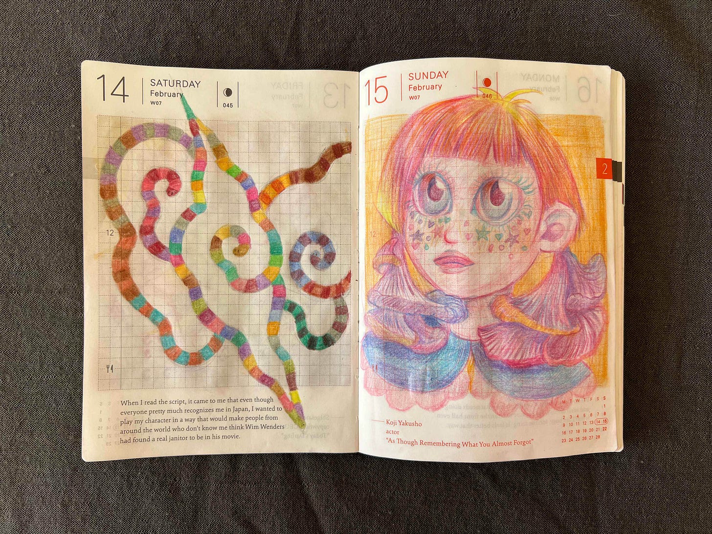 Next is my farming spread. I’ve been playing a lot of Stardew Valley this month (can’t recommend it enough for decompressing) and decided to just draw vegetables that I love: cabbages and radishes. Radishes are my favorite breakfast add-on, I have a bath of them in the fridge most of the time (so they stay crisp) and they are just so fun to draw with their natural pink gradient flush and curly tails.