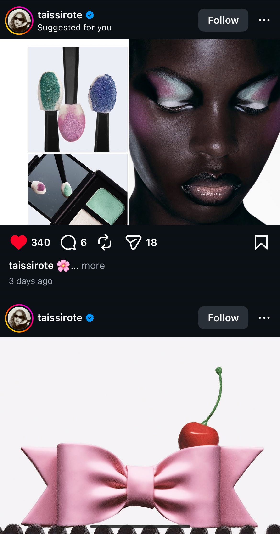 Image on the left is inspired by my Instagram feed with works by a beauty photographer Tais Sirote. I loved how the bow seemed like a continuation of the Chanel model on top. And on the right is a landscape from my friend’s house with three magic beans floating in the trembling air. I like how it’s both abstract and real.