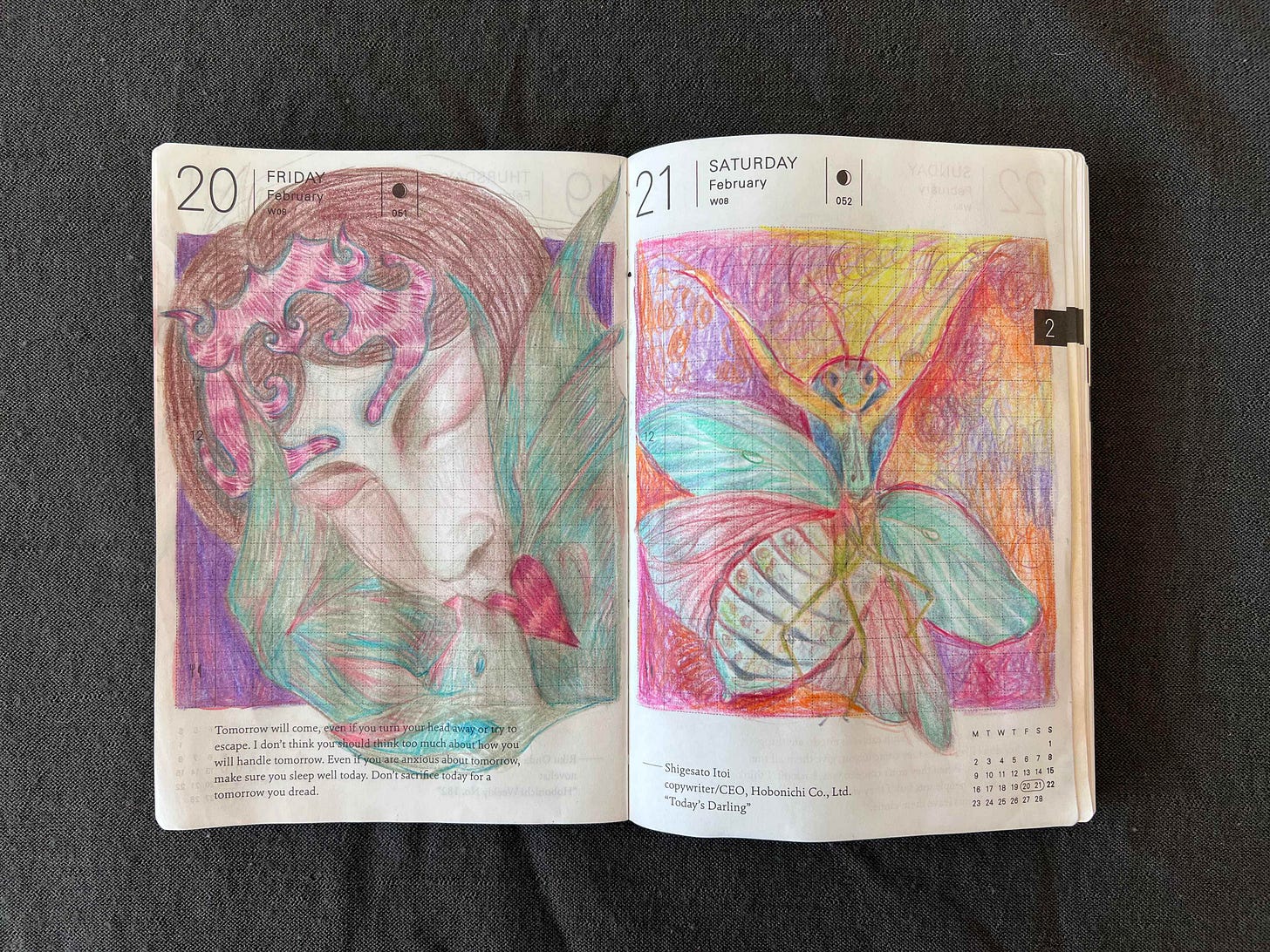 Here I tried to play more with color combinations and drew a bat and a mantis, I don’t like this spread so let’s move on to the next one.