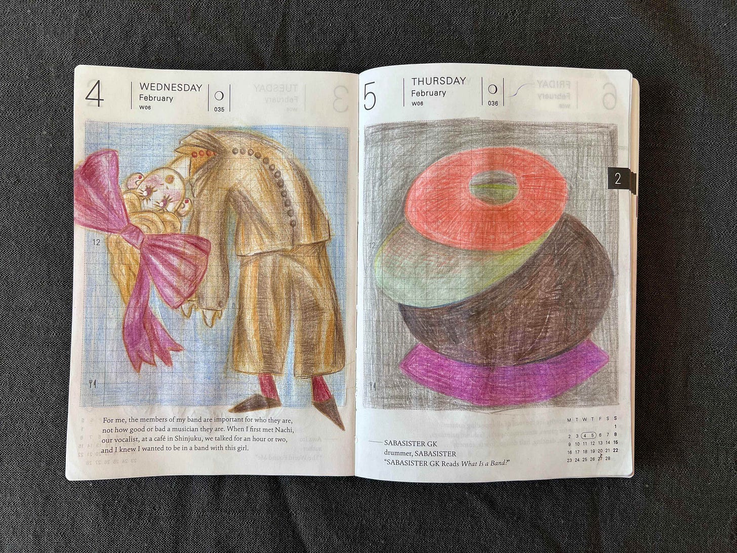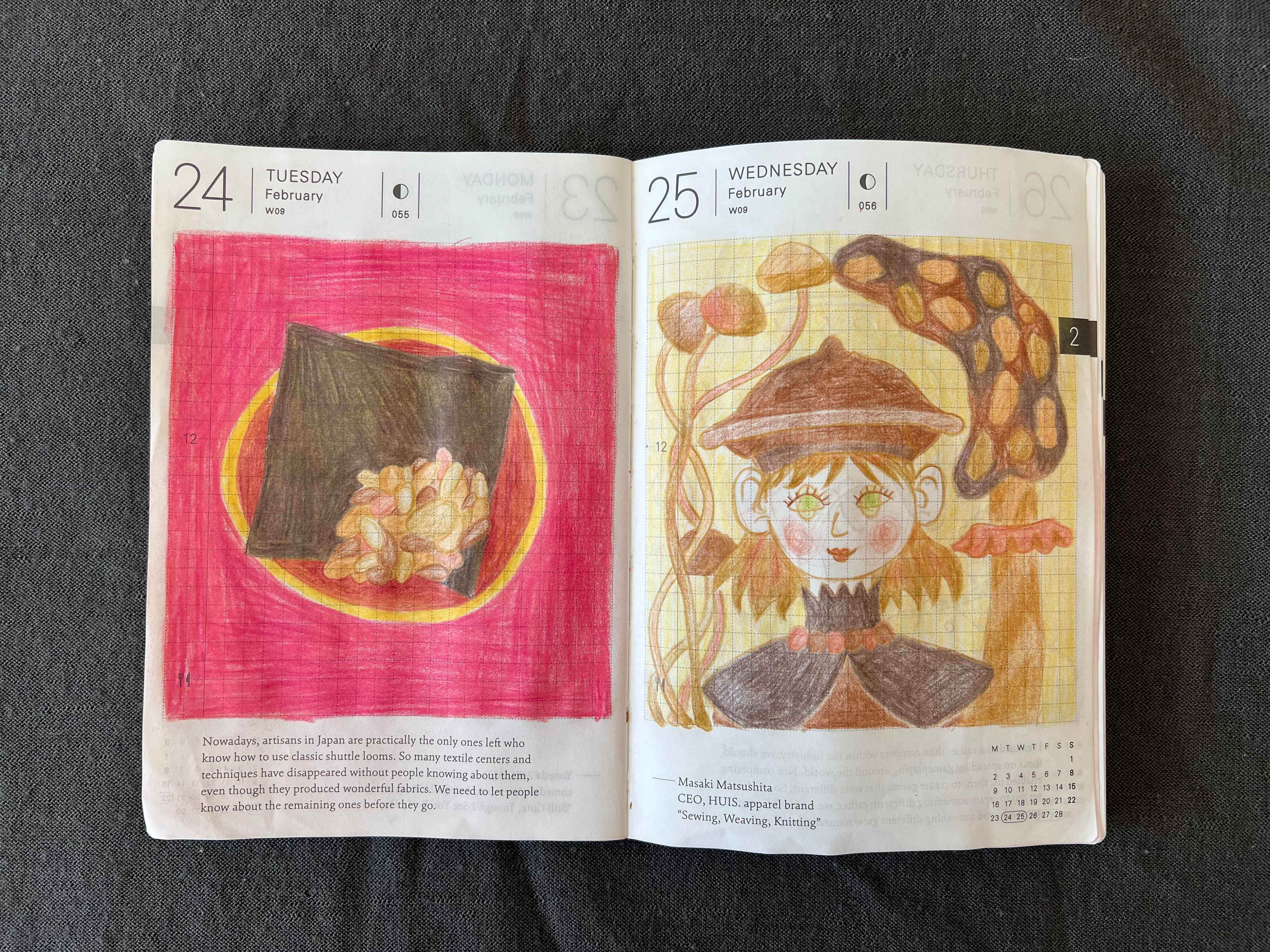 On the left here is a common snack from my table: nori sheet with some nuts. On the right is my self-portrait with Ilana Blumerg wool hat I talked about last time! It arrived that day and I felt super happy to receive it. It reminded me of a mushroom cap so the sketch theme was mushrooms. I hope I still have time to wear it this season as it got unusually warm in Madrid already.